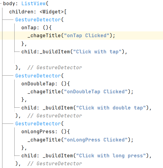Pada List View terdapat beberapa Gesture Detector yang memiliki propertinya masing-masing, dan mengimplementasikan method _buildItem yang mana mengatur lebar, tinggi dan title dari komponen yang digunakan untuk menempatkan Gesture Protector. berikut method _buildItem: