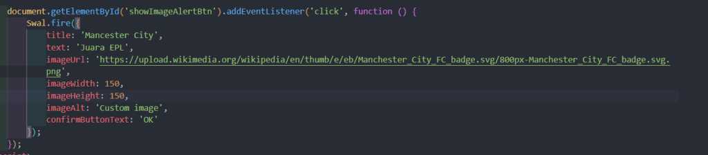Anda dapat menambahkan gambar atau ikon khusus ke dalam pesan SweetAlert dengan menggunakan properti imageUrl dan imageWidth/imageHeight untuk mengatur gambar, serta imageAlt untuk teks alternatif gambar. Berikut adalah contoh penggunaan SweetAlert dengan gambar: