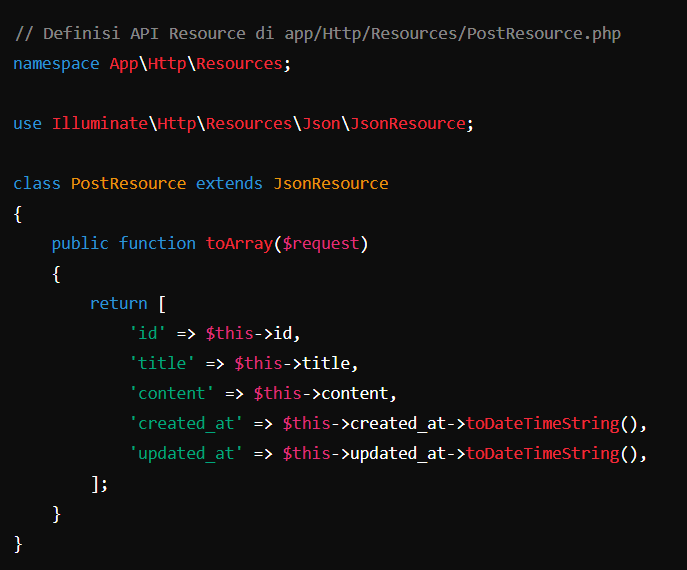 2. API Resource: Dalam konteks pengembangan aplikasi berbasis API, API Resource digunakan untuk mengontrol bagaimana data resource dikirimkan sebagai respons API. Ini memastikan bahwa hanya data yang relevan dan diperlukan yang disertakan dalam respons, memudahkan pemeliharaan dan memastikan konsistensi data yang dikirim melalui API.