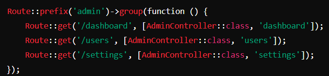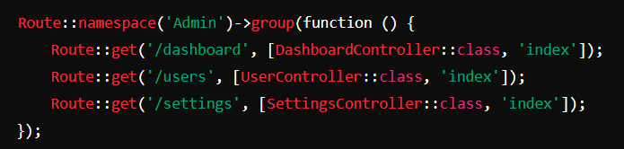 Hasilnya, Laravel akan mencari controller dalam namespace Admin, seperti Admin\DashboardController, Admin\UserController, dan Admin\SettingsController.