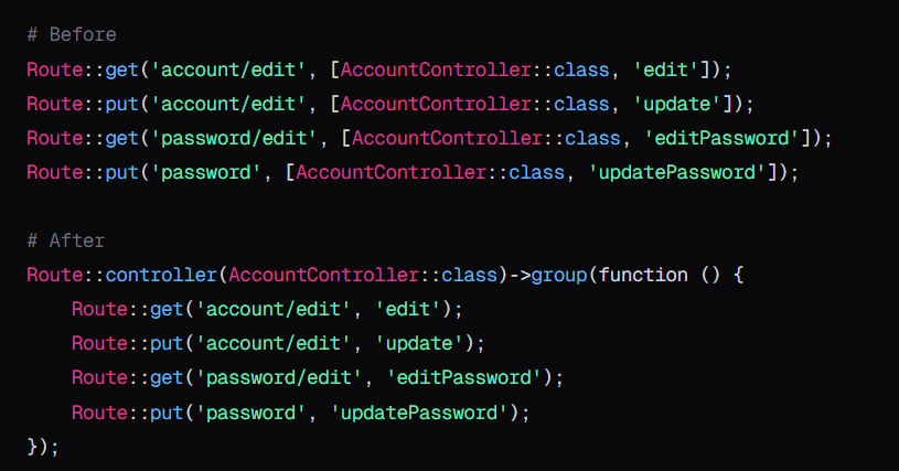 Jika Anda pernah membuat route yang berulang-ulang dengan controller yang sama, maka sekarang Anda bisa group mereka dengan cara mengkelompokkan nya dengan controller.