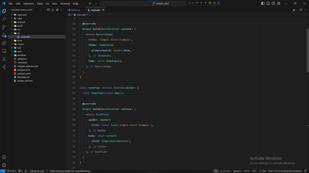 Buka file lib/main.dart dan ganti isinya dengan kode berikut untuk mengimplementasikan simple alert: