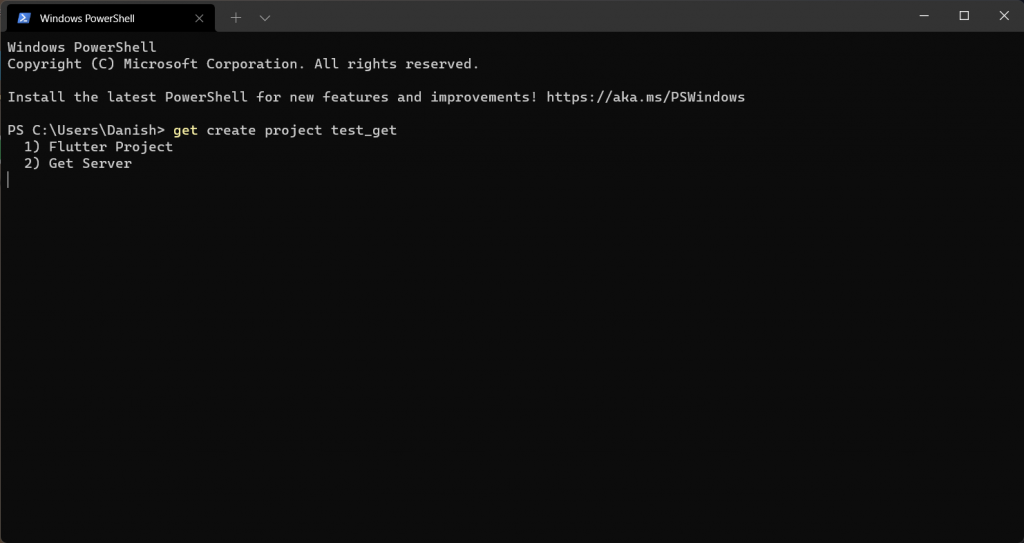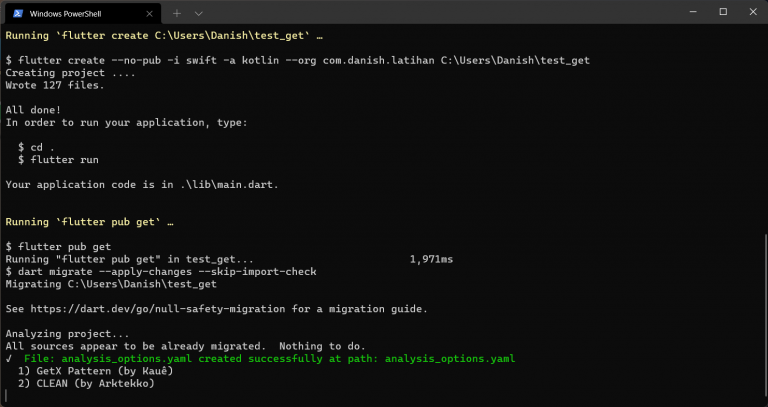 untuk membuat project flutter dengan Get CLI kita bisa dengan mudah ketik pada terminal get create project nama_project_kalian
