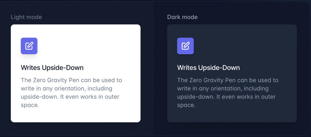 Diatas adalah adalah komponen sama, yang membuat kedua tersebut beda secara tampilan adalah yang pertama memakai setelan default dan yang kedua menggunakan setelan mode gelap yang didefinisikan menggunakan class setelah variant ‘dark’ di class.